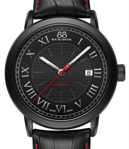 88 RUE DU RHONE automatic watch model 87WA120041. Black PVD finished stainless steel case. Black textured dial with 8-filigree motif, Roman numerals and date calendar. Sapphire crystal. Black leather strap with red color stitching.