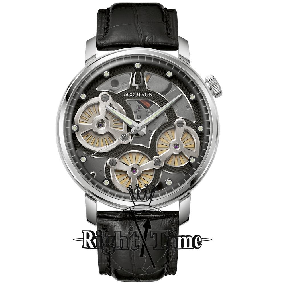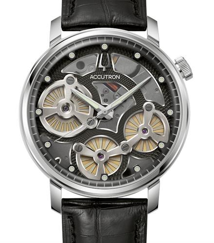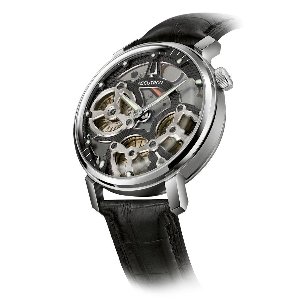 Accutron Spaceview Evolution Electrostatic model 26A210. Powered by Accutron proprietary electrostatic movement. Smoke grey open-work dial. Stainless steel case with black alligator leather band.