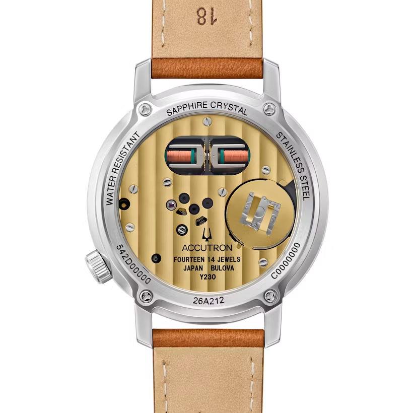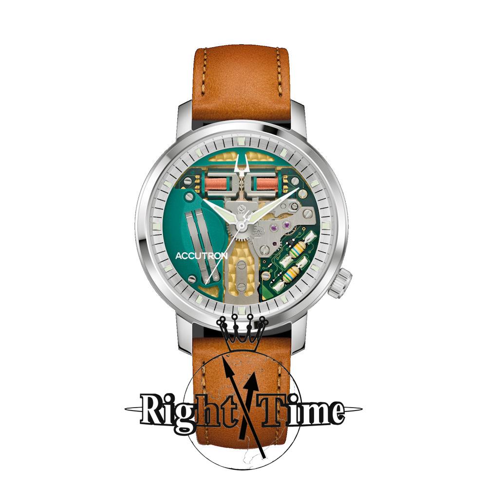 Accutron Spaceview 314 model 26A212. Powered by Accutron Caliber 314 movement. Green open-work dial. Stainless steel case with brown leather band.