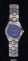 Accutron Lady watch 26M01 from Accutron Barcelona Collection. Solid Stainless steel, very slim, brushed case with highly polished bezel. Swiss quartz movement. Blue Mother-of-Pearl dial with date calendar and silver color hands and Roman markers. Solid Stainless steel watch bracelet with center opening deployment clasp and spring release.