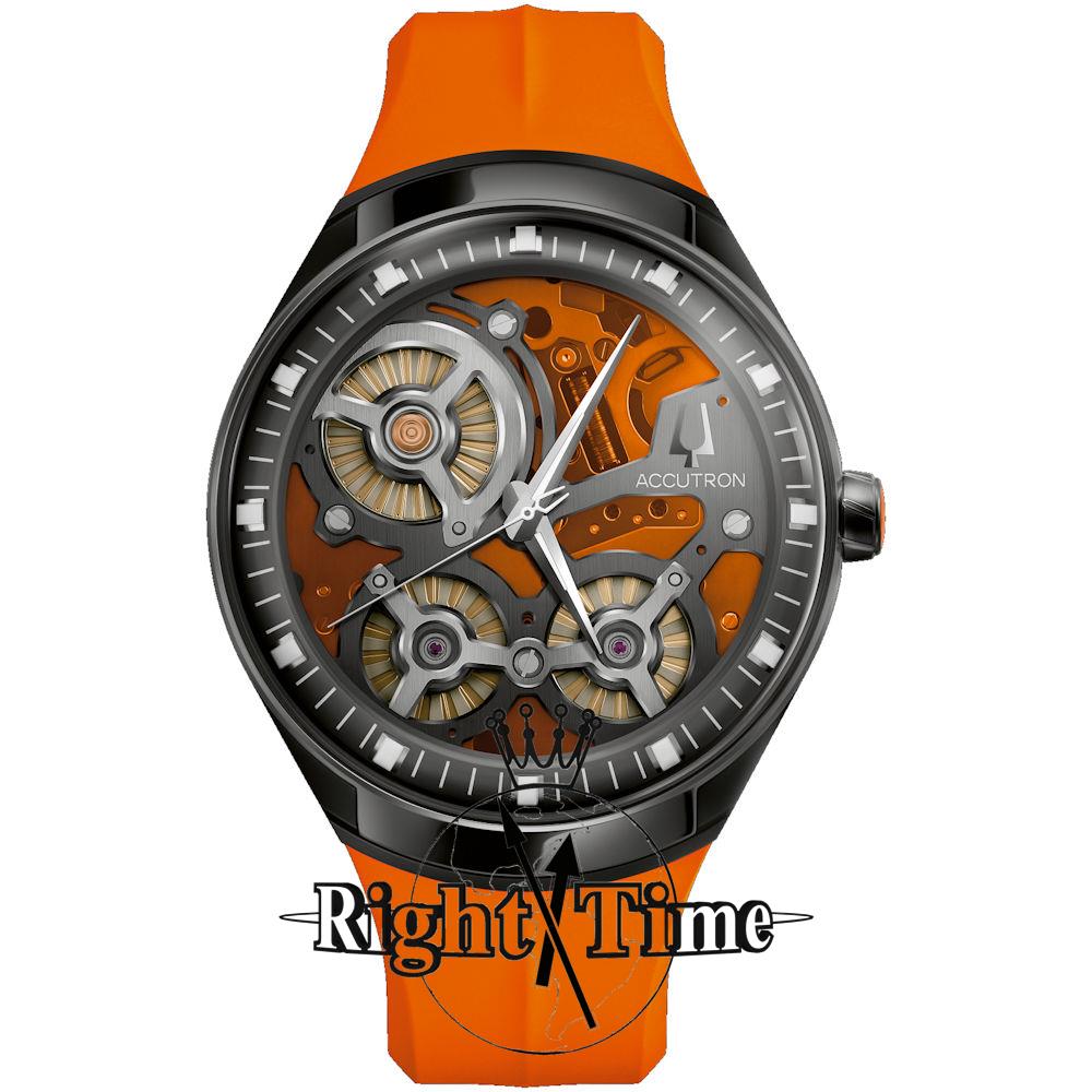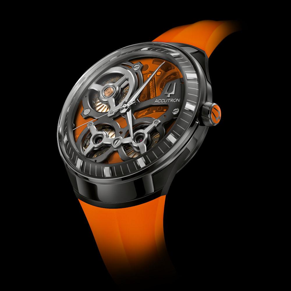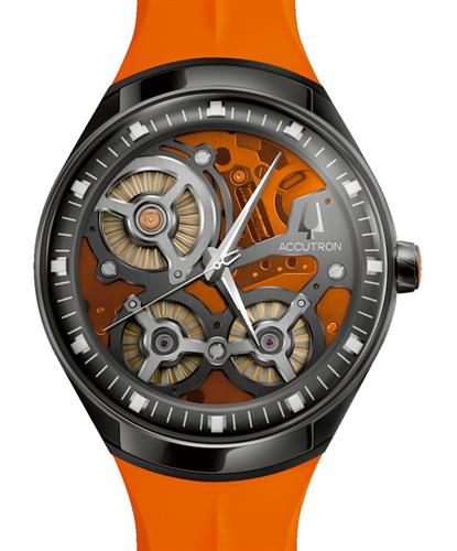 Accutron DNA Casino Collection. Model 28A205. Orange dial is one of the four colors: green, blue, orange, and red, that echo the neon city skyline and the bright atmosphere of Las Vegas and its iconic casinos. Powered by Accutron proprietary electrostatic movement. Open dial with grey outer minutes ring. Stainless steel case with orange rubber band. Limited Edition of 100 pieces