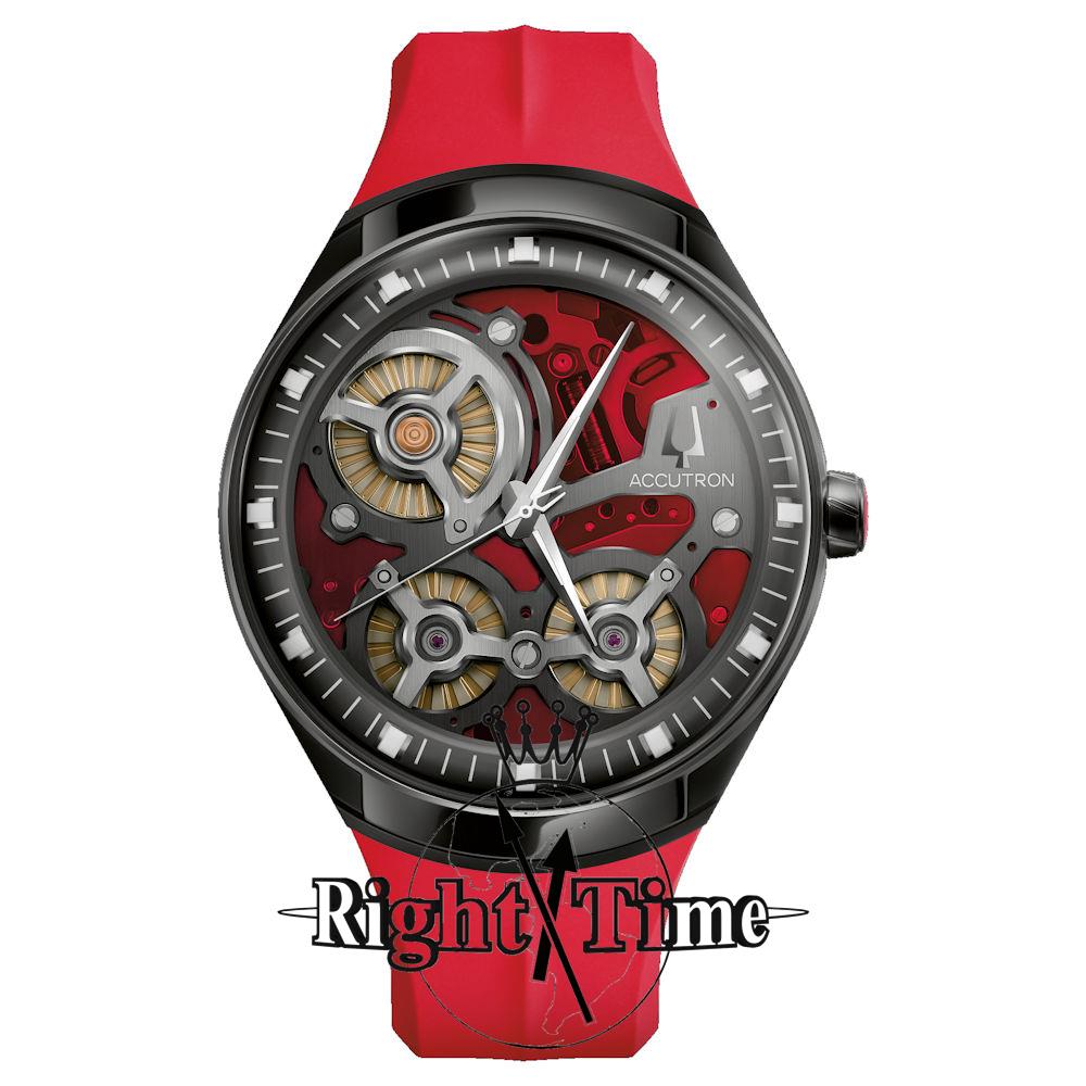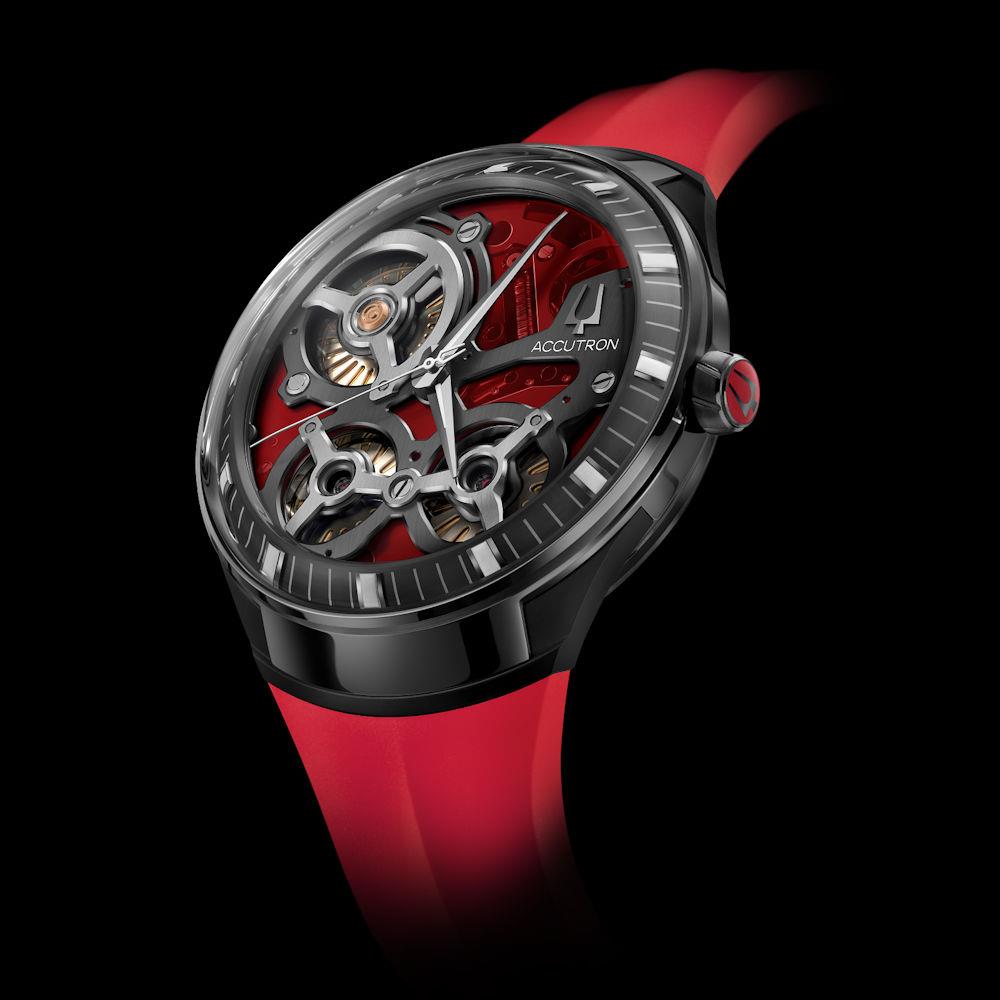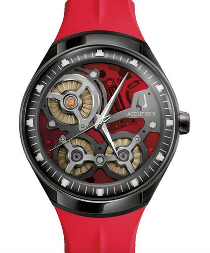 Accutron DNA Casino Collection. Model 28A206. Red dial is one of the four colors: green, blue, orange, and red, that echo the neon city skyline and the bright atmosphere of Las Vegas and its iconic casinos. Powered by Accutron proprietary electrostatic movement. Open dial with grey outer minutes ring. Stainless steel case with red rubber band. Limited Edition of 100 pieces