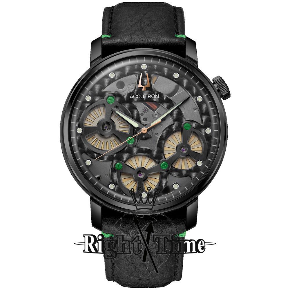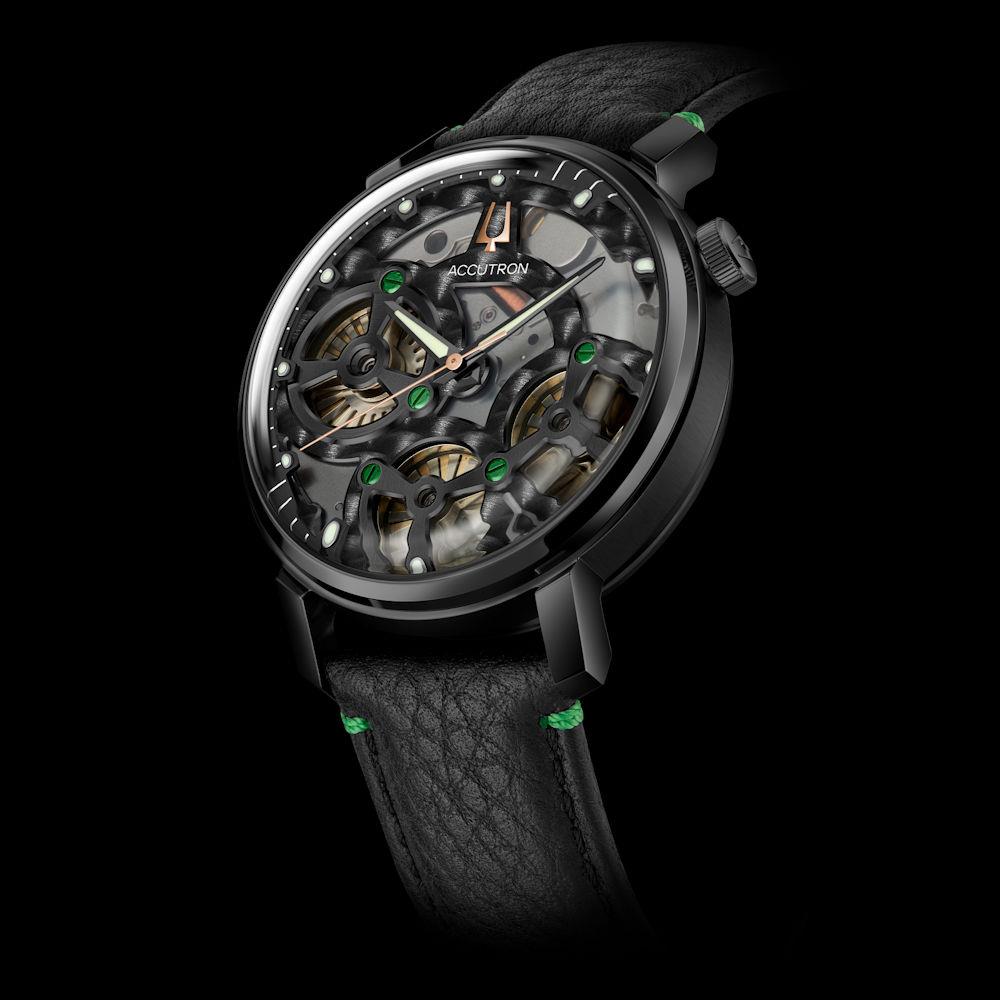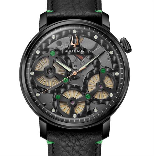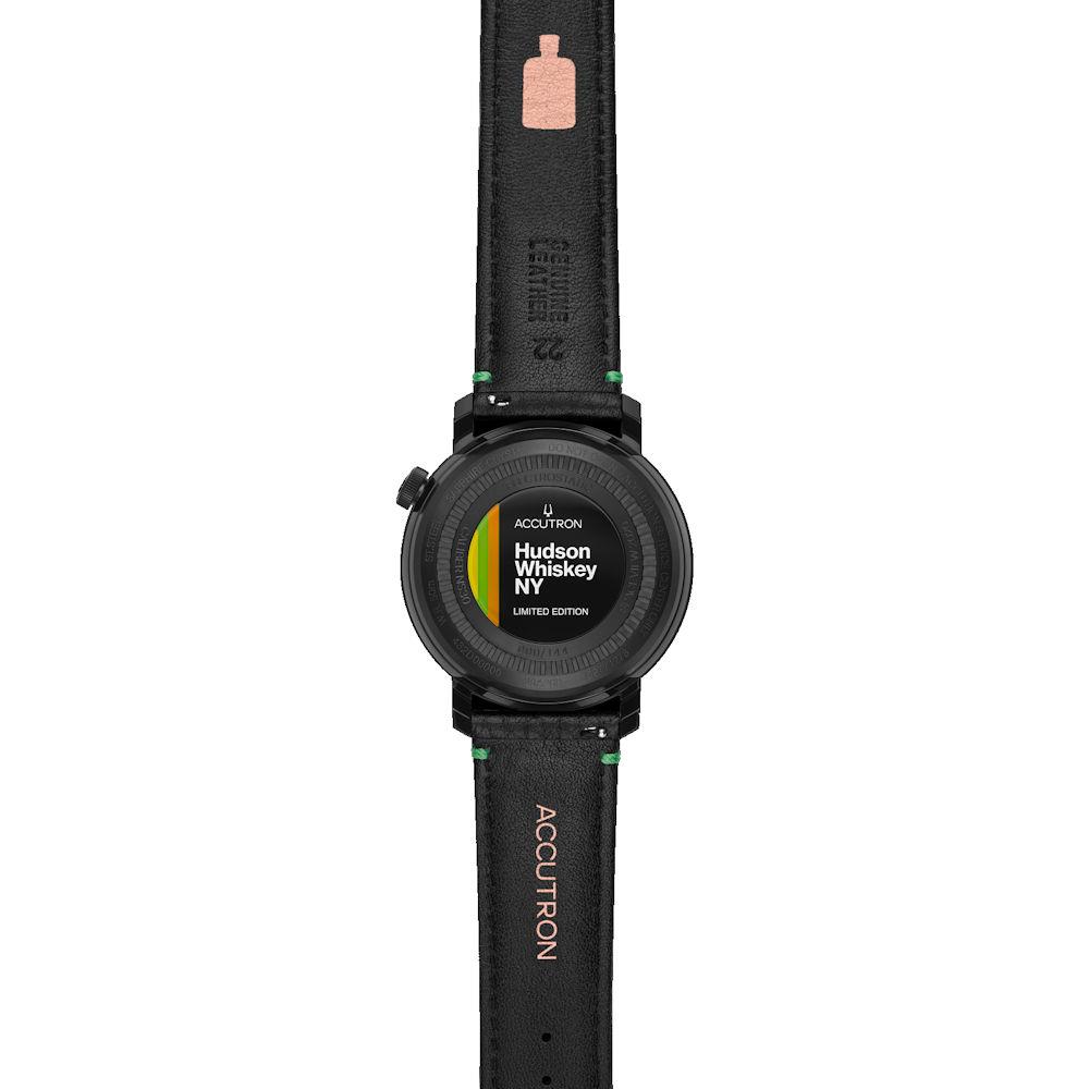 Accutron Spaceview Evolution X Hudson Whiskey model 28A209. Powered by Accutron proprietary electrostatic movement. Blackout open-work dial. Black stainless steel case with black leather band and green color accents. Accutron and Hudson Whiskey logos on the case back. Limited Edition of 144 pieces.