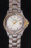 Ladies Accutron watch 28B54 from Accutron Vera Cruz Collection. Combination Solid Stainless steel and 18kt Gold, very slim, brushed case with tungsten steel accents. Swiss quartz movement. Ivory textured dial with date calendar and gilt color hands and markers. Solid Stainless steel with 18kt Gold watch band and center opening deployment clasp with spring release.