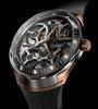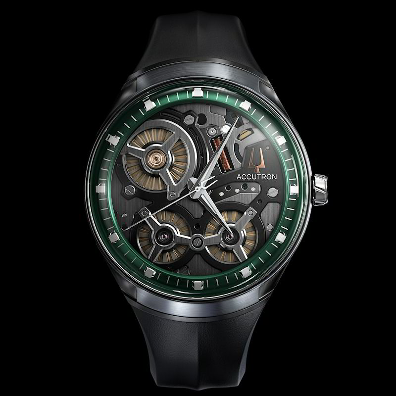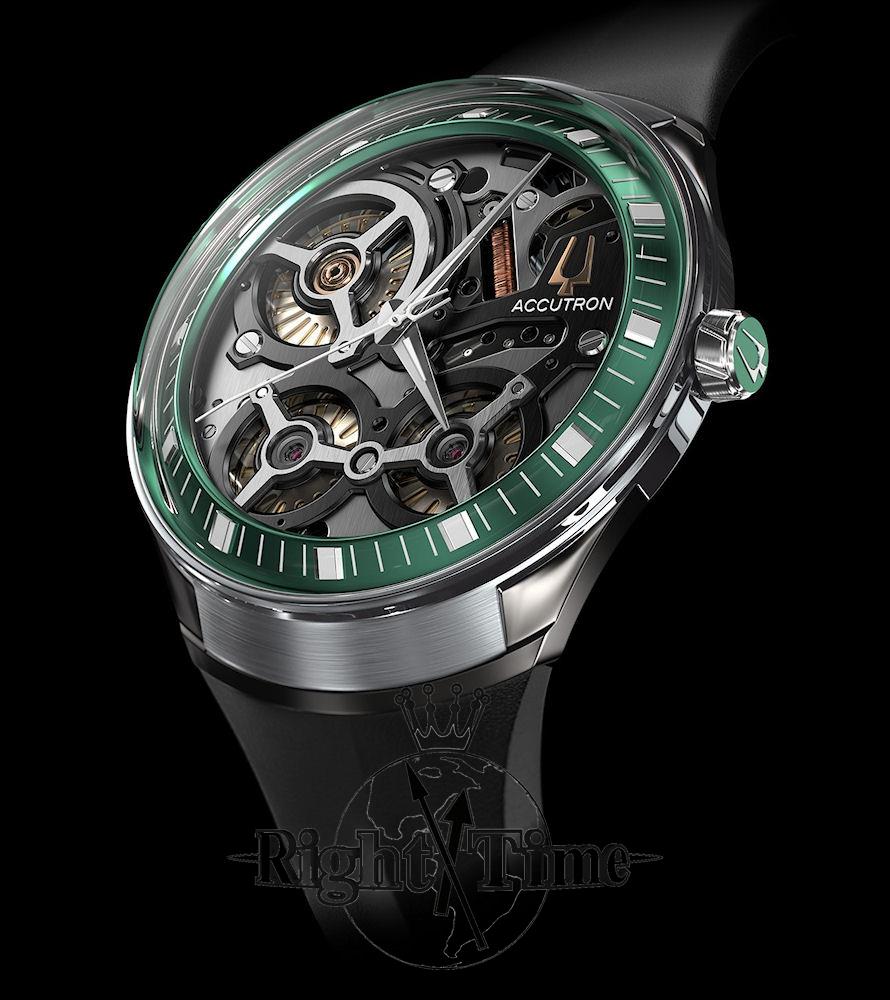 Accutron DNA Collection. Model 2ES8A001. Powered by Accutron proprietary electrostatic movement. Open dial with green outer minutes ring. Stainless steel case with black rubber band.