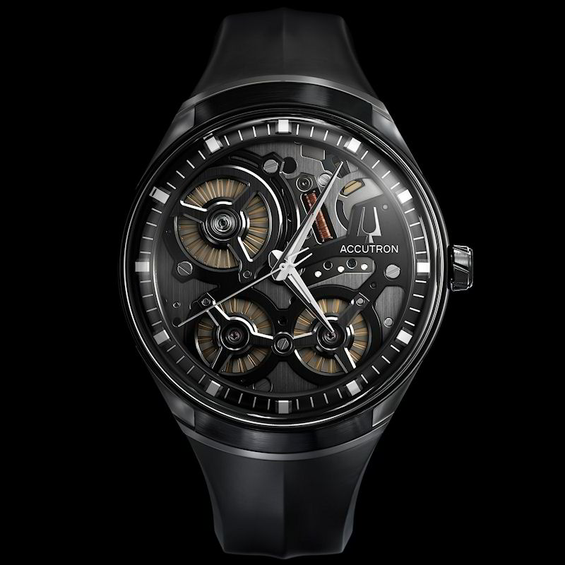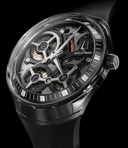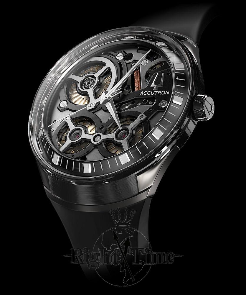 Accutron DNA Collection. Model 2ES8A003. Powered by Accutron proprietary electrostatic movement. Open dial with black outer minutes ring. Stainless steel case with black plated accents and black rubber band.