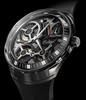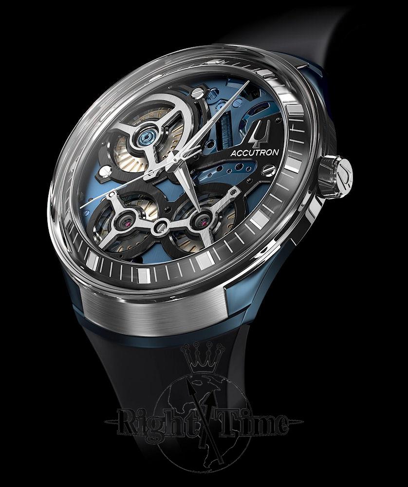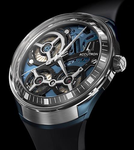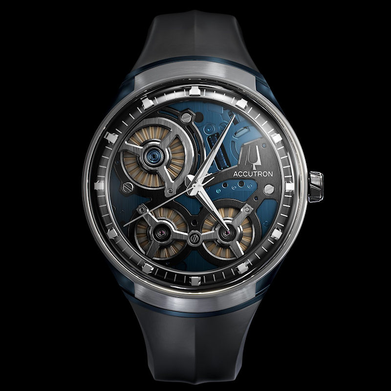 Accutron DNA Collection. Model 2ES8A004. Powered by Accutron proprietary electrostatic movement. Blue open dial with black outer minutes ring. Stainless steel case with blue plated accents and black rubber band.