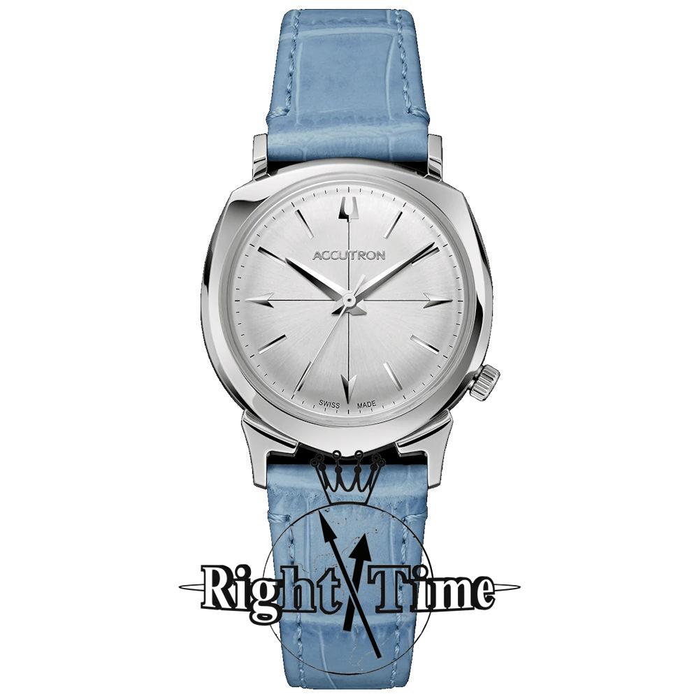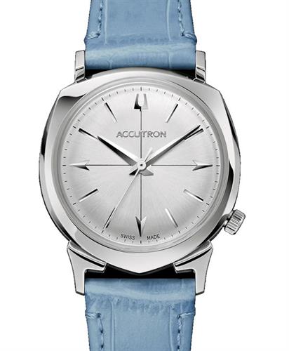 Accutron Legacy Collection. Model 2SW6A001PE. Based on original Accutron "505" design, first launched in 1960. Swiss automatic movement. Stainless steel case. Silver color dial. Blue leather strap. Limited Edition of 600 pieces.