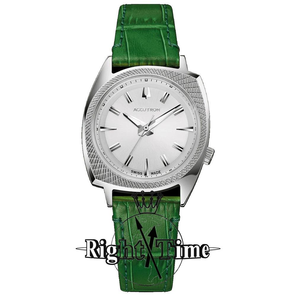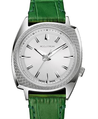 Accutron Legacy Collection. Model 2SW6A002GN. Based on original Accutron "565" design, first launched in 1966. Swiss automatic movement. Stainless steel case with "cross-hatching" design. Green leather strap. Limited Edition of 600 pieces.