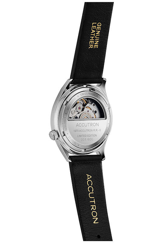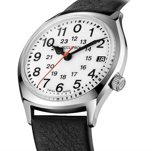 Accutron Legacy Collection. Model 2SW6B001. Based on original Accutron "R.R.-O" design, first launched in 1970. Swiss automatic movement. Stainless steel "railroad design" case with a crown at 4 o`clock. White dial, with a 0 at the 12-hour mark to meet Canadian Railroad specs, and a red second hand. Limited Edition of 600 pieces.
