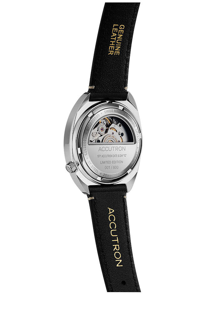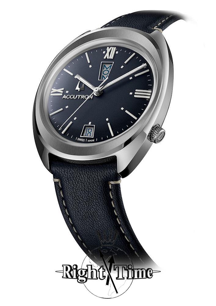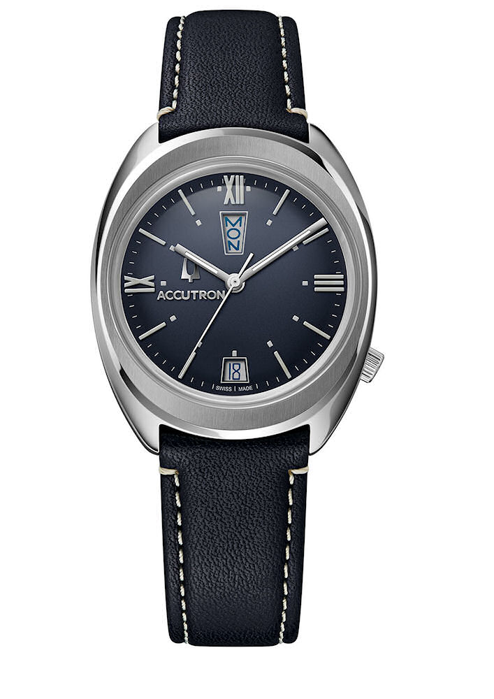 Accutron Legacy Collection. Model 2SW6C001. Based on original Accutron Date and Day "Q" design, first launched in 1960. Swiss automatic movement. Oval stainless steel case. Dark blue dial. Blue leather band. Limited Edition of 600 pieces.