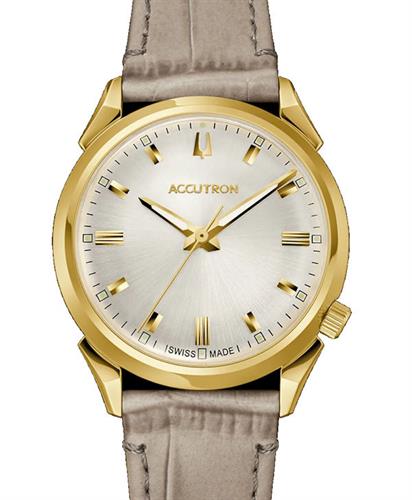 Accutron Legacy Collection. Model 2SW7A004LG. Based on original Accutron "412" design, first launched in 1960. Swiss automatic movement. Gold plated stainless steel case. Silver color dial. Grey leather strap. Limited Edition of 600 pieces.