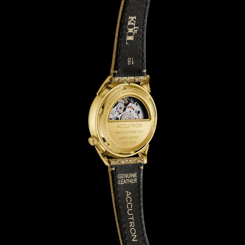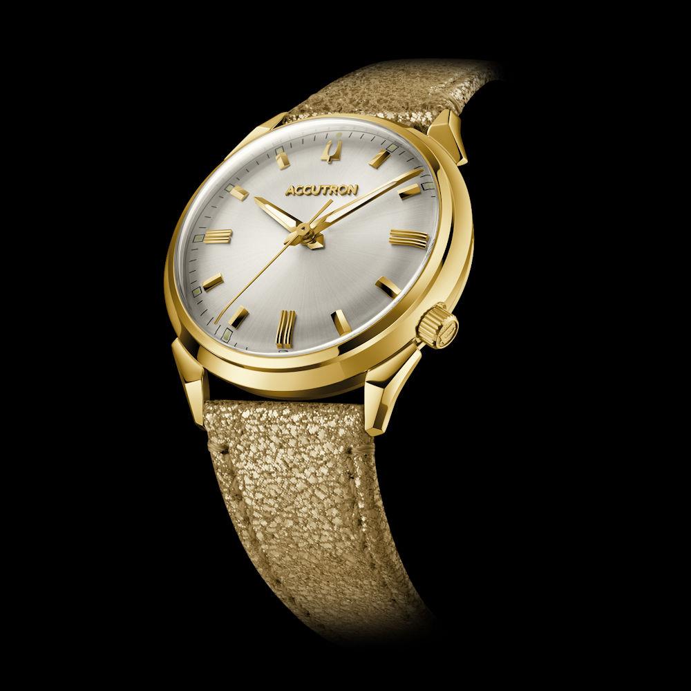 Accutron Legacy Collection. X LE KOOL Model 2SW7A004LK. Based on original Accutron "565" design, first launched in 1966. Swiss automatic movement. Stainless steel yellow gold plated case with "cross-hatching" design. Comes on a gold metallic leather strap with two additional black and bronze metallic leather straps. Limited Edition of 600 pieces.