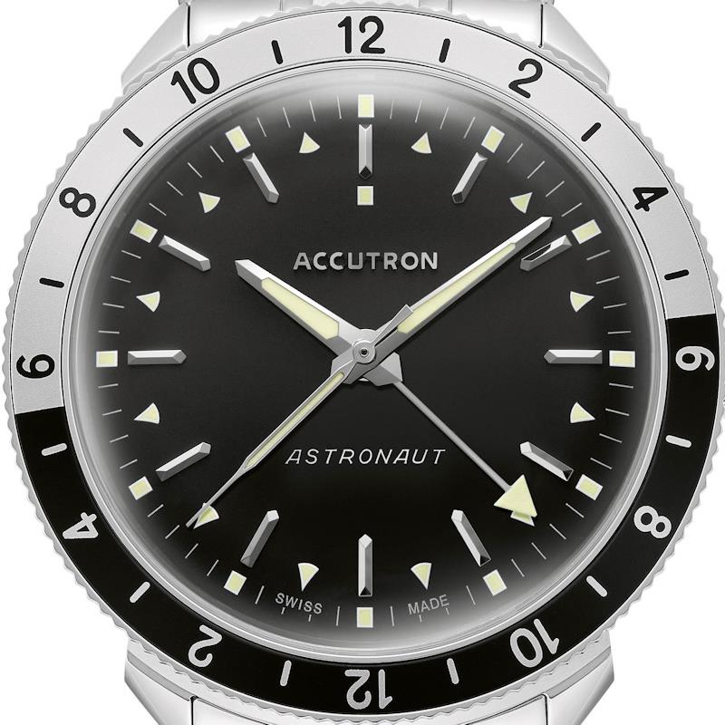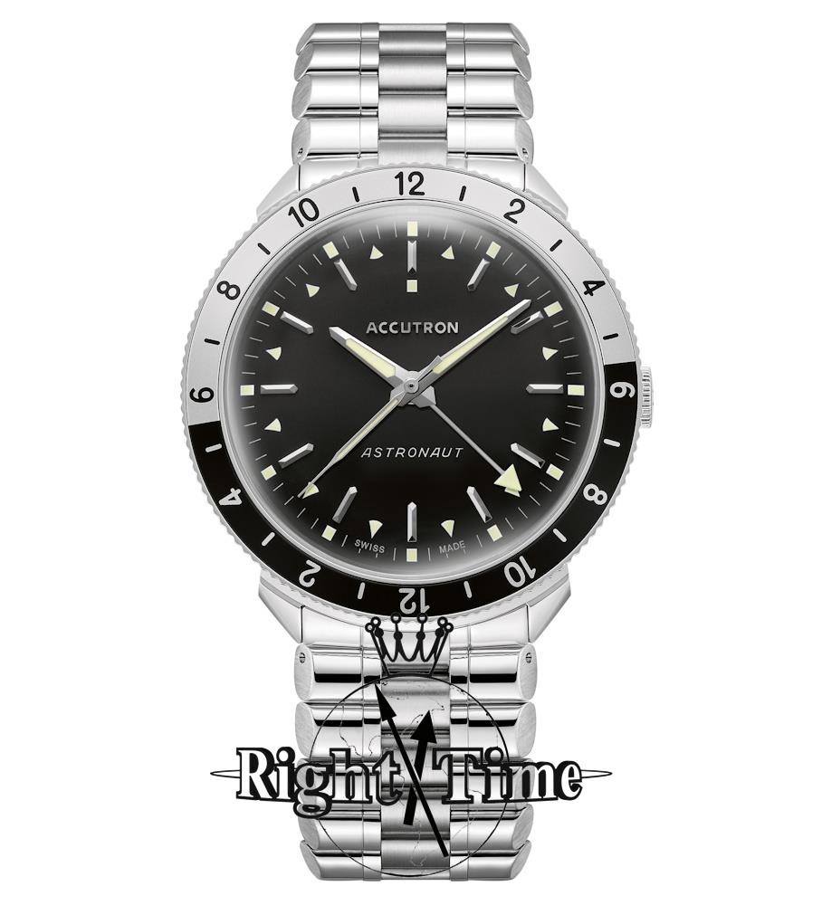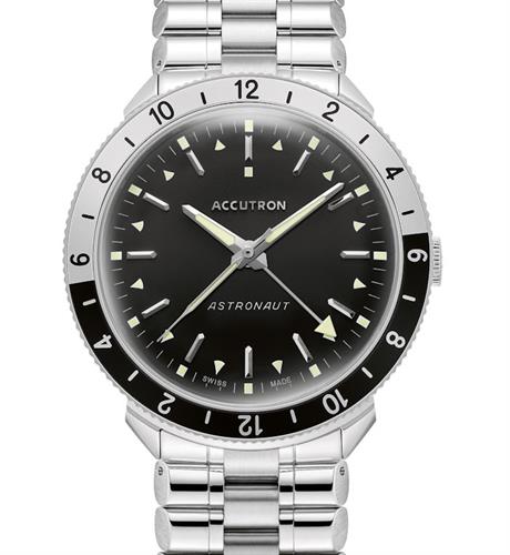Accutron Legacy Collection. Model 2SW8A002 ASTRONAUT "T". Swiss automatic movement. Stainless steel case with rotating 12 hours bezel. Black dial with second time zone hand indicator. Steel bracelet. Limited Edition of 300 pieces.