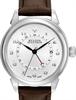 Bulova Accutron stainless steel automatic watch from Accutron Gemini Collection. Steel textured dial with date calendar and second time-zone indicator. Round case with sapphire crystal and brown leather band.