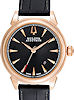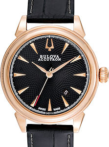 Accutron "Gemini" model 64B116 has black textured dial with applied polished markers. Sellita automatic movement. Rose gold plated stainless steel case with black leather strap