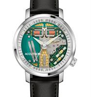 Accutron Spaceview 2020 Collection. Model 2ES6A005. Powered by Accutron proprietary electrostatic movement. Signature Accutron green open dial with black accents. Stainless steel case with black leather band.