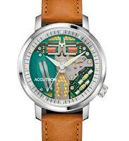 Accutron Spaceview 2020 Collection. Model 2ES6A004. Powered by Accutron proprietary electrostatic movement. Grey open dial with signature Accutron green accents. Stainless steel case with orange leather band.