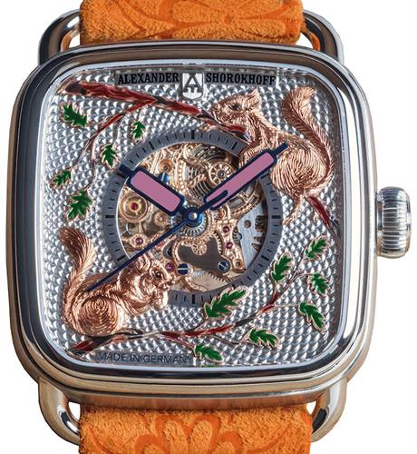Alexander Shorokhoff Alexander Pushkin Collection model "Squirrel" Limited Edition of 25 pieces. Manufactured in honor of Alexander Pushkin - brilliant Russian poet. Watch is powered by hand engraved manual-winding movement. Two squirrels in a deep forest are jumping on branches. Their faces and fur are engraved by hand with high precision. Branches and leafs are covered with enamel