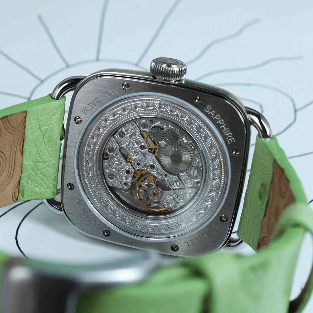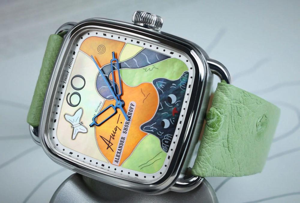 Alexander Shorokhoff "Black Cat Handwinding" Limited Edition of 19 pieces. Bold color combinations. Cat is crafted from black mother-of-pearl, it partially conceals itself on the dial, but its presence is unmistakable. The cat exudes playfulness, courage, and a hint of curiosity towards the butterfly that has found its place in the upper part of the dial. Powered by hand-wound 2009.AS caliber movement with hand engraving and finishing in steel case with green leather band.