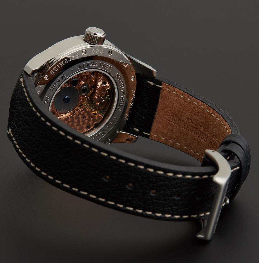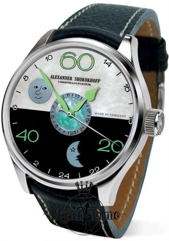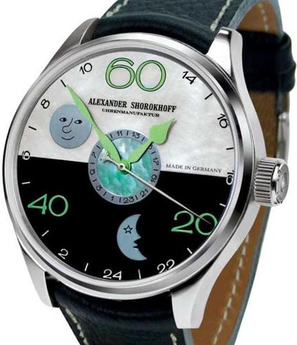 Alexander Shorokhoff "Day & Night". Just like the day at the equator black enameled and Mother-of-Pearl dial is divided into two equal halves with two symbols of sun and moon. Powered by manual winding movement.