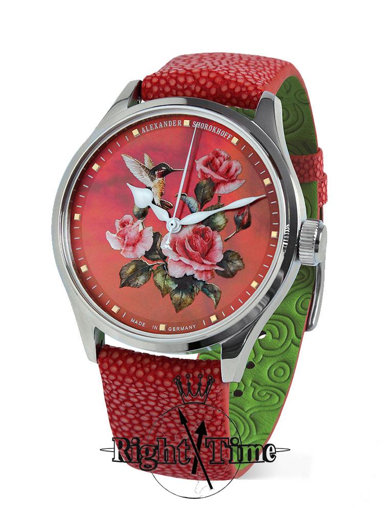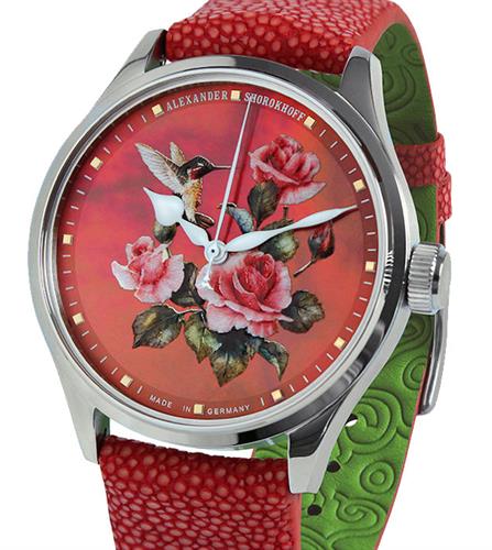 Alexander Shorokhoff Avantgarde "THE DANCE OF THE HUMMINGBIRD". Watch model AS.LA01-CBR2. The first dial with a modern 3D printing process by Alexander Shorokhoff. Limited Edition of 35 pieces. Red bordeaux-colored mother-of-pearl dial with floral 3D print.