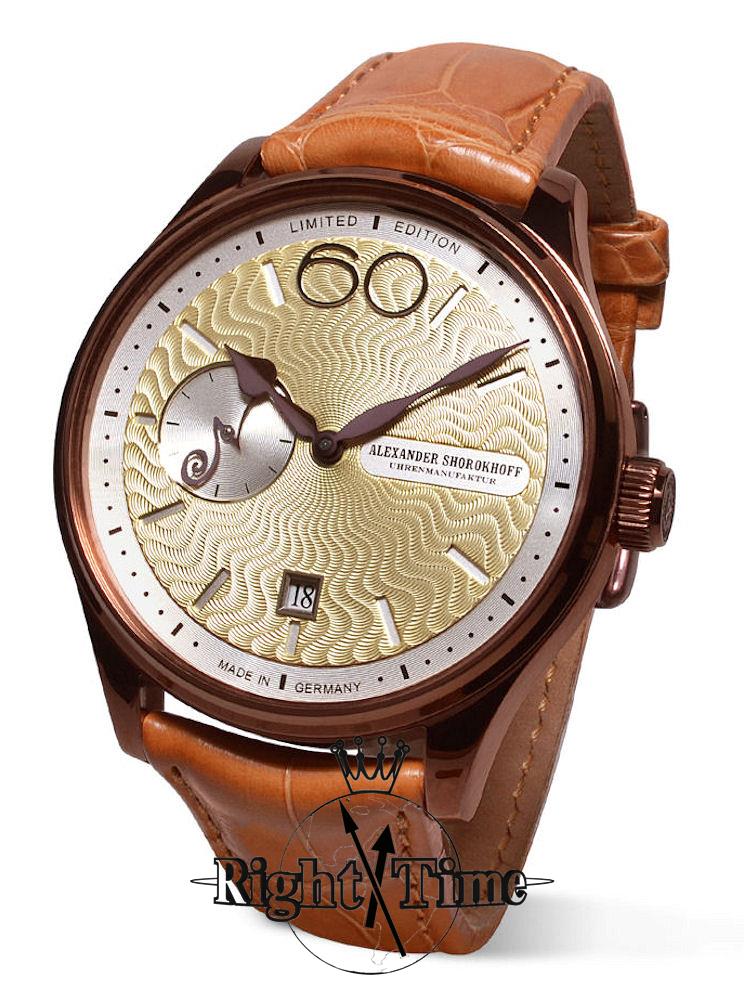 Alexander Shorokhoff "NEVA" Limited Edition of 98 pieces. Powered by hand-wound movement. Cooper PVD plated steel case with orange leather strap. Champagne wavy guilloche dial is inspired by the European river Neva. Small seconds silver tone sub-dial with curved second hand shaped like the letter "N".