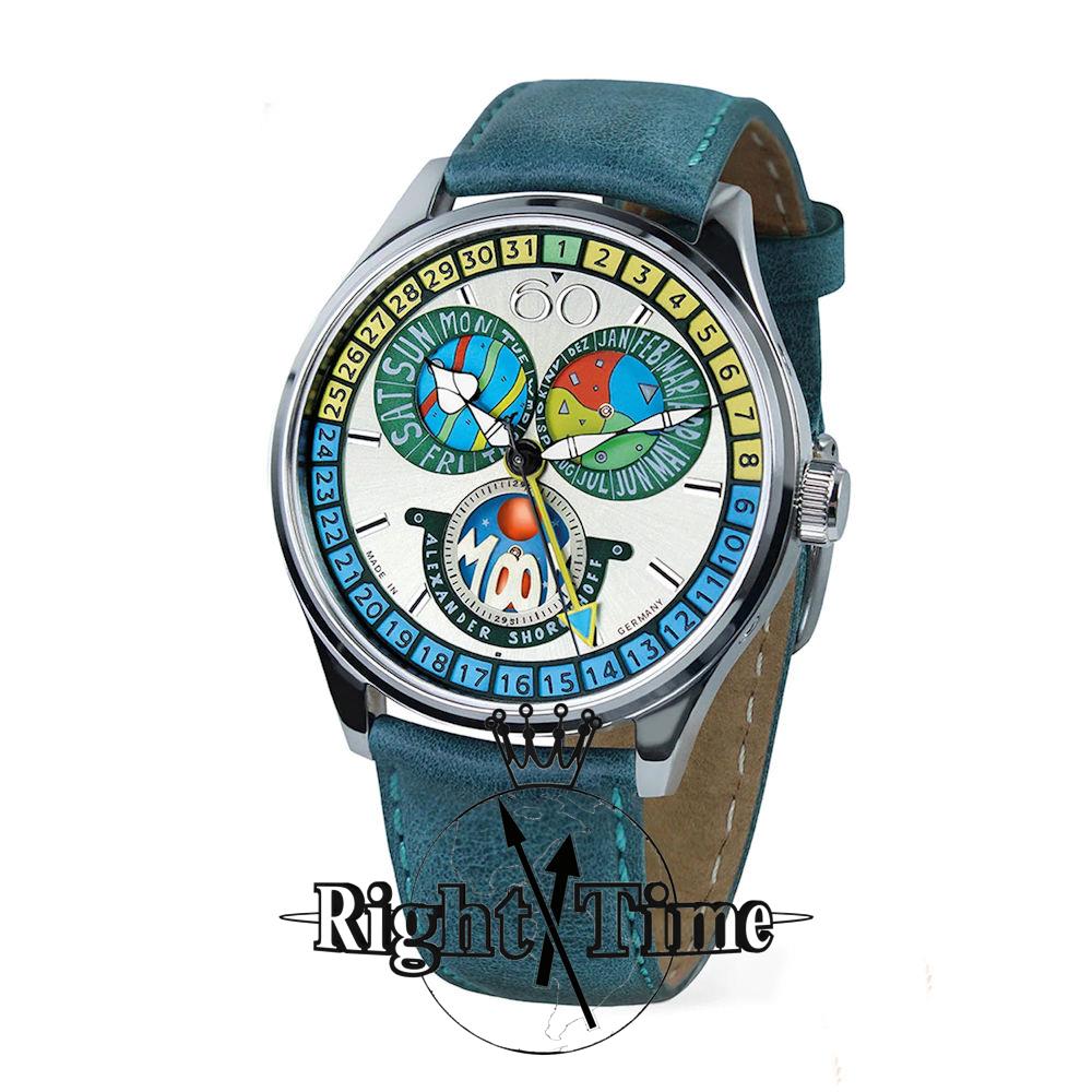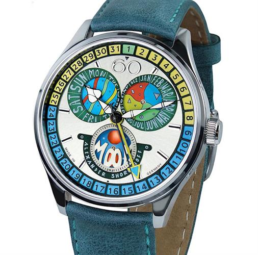Alexander Shorokhoff "Cadamomo" Limited Edition of 50 pieces. Full Calendar Cadamomo, a striking timepiece that embodies the essence of avant-garde design. The name "Cadamomo" reflects its multifunctional nature: "CA" for calendar, "DA" for day, "MO" for month, and a second "MO" for moon. This innovative watch showcases a central yellow date hand with a blue tip for highlighting the day, while the day of the week and month are displayed at 10 o`clock and 2 o`clock, respectively. The moon phase, presented as a small disc at 6 o`clock, offers a traditional yet aesthetic touch, revealing the current moon phase in its celestial journey.