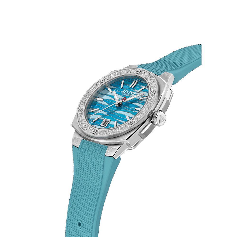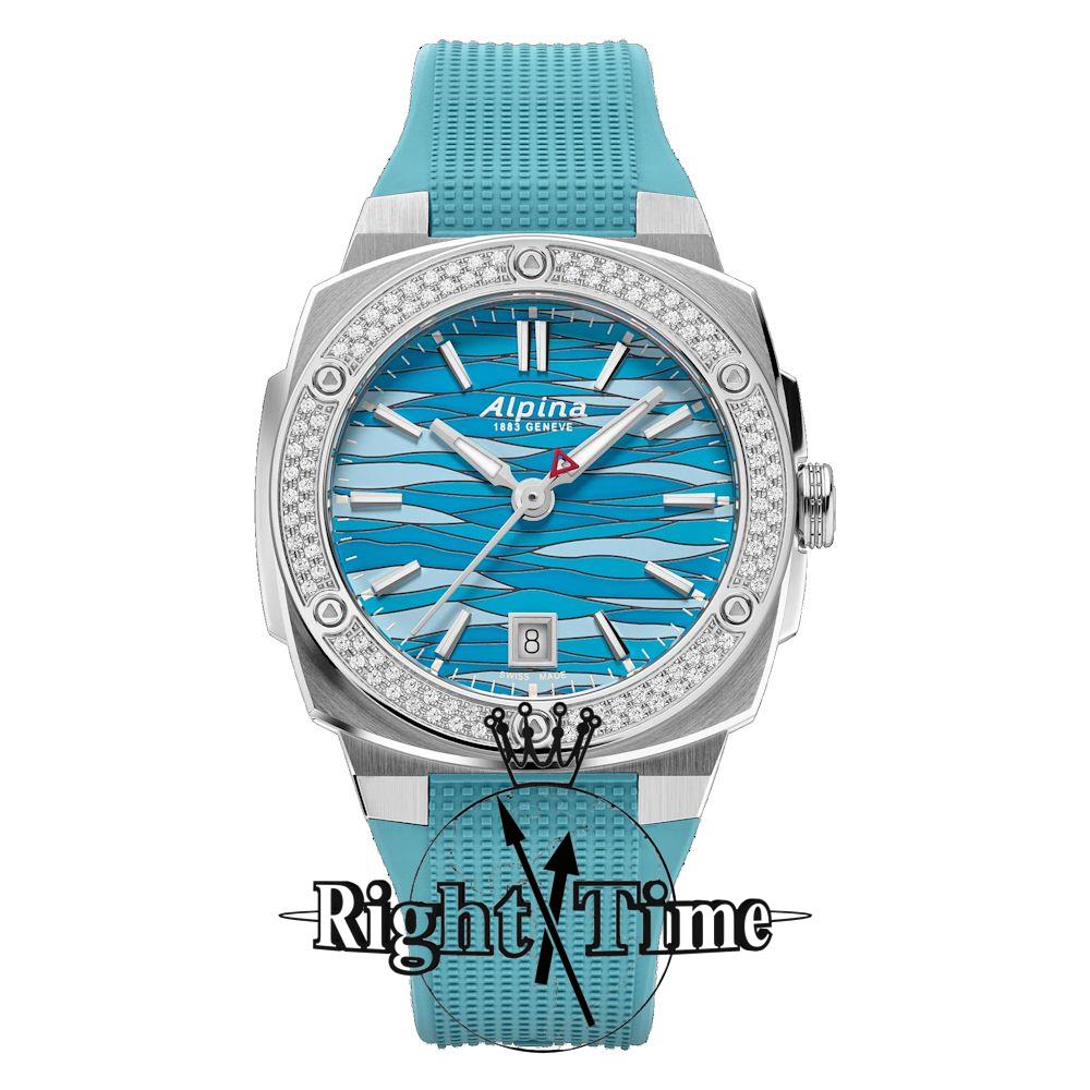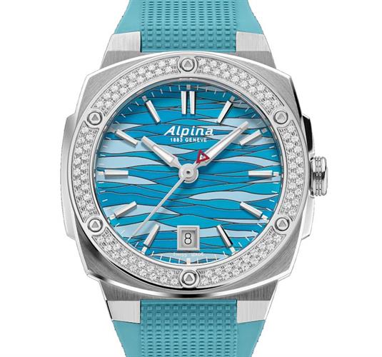 Alpina Alpiner Extreme Quartz watch model AL-220LNWP2AED6. Swiss quartz movement with date. Stainless steel case with sapphire crystal. Diamonds on the bezel. Ice blue dial with air pattern. Blue rubber band. Limited Edition of 83 pieces.