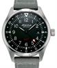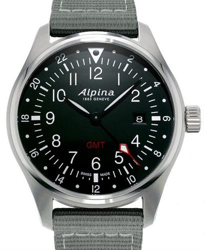 Alpina Startimer Pilot GMT model AL-247B4S6. Swiss quartz movement. Stainless steel case with grey canvas strap. Sapphire crystal. Black dial designed for Professional pilots with 0-24 hours ring, and seconds time-zone pointing hand. 100 meters water resistant.