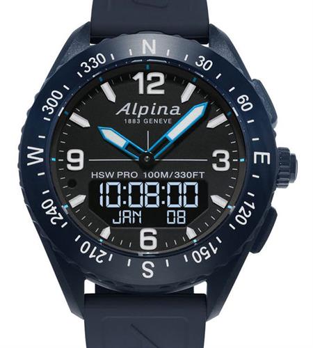 Alpina AlpinerRX Horological Smartwatch model AL-283LBN5NAQ6. Watch functions: activity tracking, sleep tracking, dynamic coach, world time, alarm, calls and messages notifications, UV indicator, altitude, compass, temperature, and barometer. Swiss quartz ana-digital movement. Blue stainless steel and fiber glass case with sapphire crystal and engraved case back. Black color dial with blue luminous hands and white markers. Blue rubber band