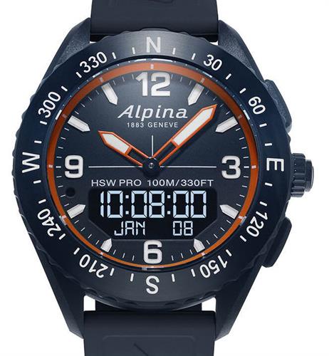 Alpina AlpinerRX Horological Smartwatch model AL-283LNO5NAQ6. Watch functions: activity tracking, sleep tracking, dynamic coach, world time, alarm, calls and messages notifications, UV indicator, altitude, compass, temperature, and barometer. Swiss quartz ana-digital movement. Black stainless steel and fiber glass case with sapphire crystal and engraved case back. Navy blue color dial with orange outer ring, luminous hands and white markers. Navy blue rubber band