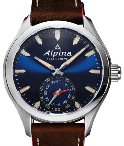 Alpina Gents Horological Smartwatch. Model AL-285NS5AQ6. All function adjustable via crown: Always-on time and date; MotionX activity tracking; Sleeptracker sleep monitoring; Sleep cycle alarms; Get-Active alerts; Smart coaching; World Time 24 Time Zones; MotionX cloud backup and restore. IOS and Android compatible. Stainless steel 44mm case with brown leather band. Sapphire crystal. Blue dial with luminous hands and markers. Water resistant to 100 meters