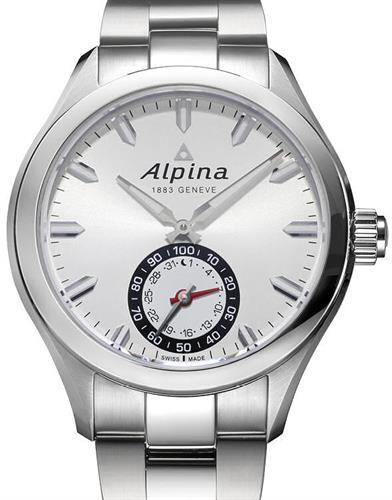 Alpina Gents Horological Smartwatch. Model AL-285S5AQ6B. All function adjustable via crown: Always-on time and date; MotionX activity tracking; Sleeptracker sleep monitoring; Sleep cycle alarms; Get-Active alerts; Smart coaching; World Time 24 Time Zones; MotionX cloud backup and restore. IOS and Android compatible. Stainless steel 44mm case with bracelet. Sapphire crystal. Silver color dial with luminous hands and markers. Water resistant to 100 meters