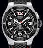 Alpina Racing chronograph quartz with black dial and black sub-dials. Stainless steel case with black PVD accents. Genuine leather band with carbon fiber finish and contrasting red stitching to match red accents on the dial. Stainless steel deployant buckle with spring release. Factory model number AL-352LBR5AR6.