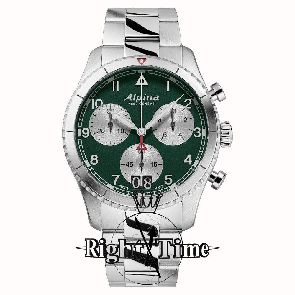 Swiss made Alpina "Startimer" pilot quartz military chronograph big date model AL-372GRS4S26B in 41mm stainless steel case with green dial on bracelet