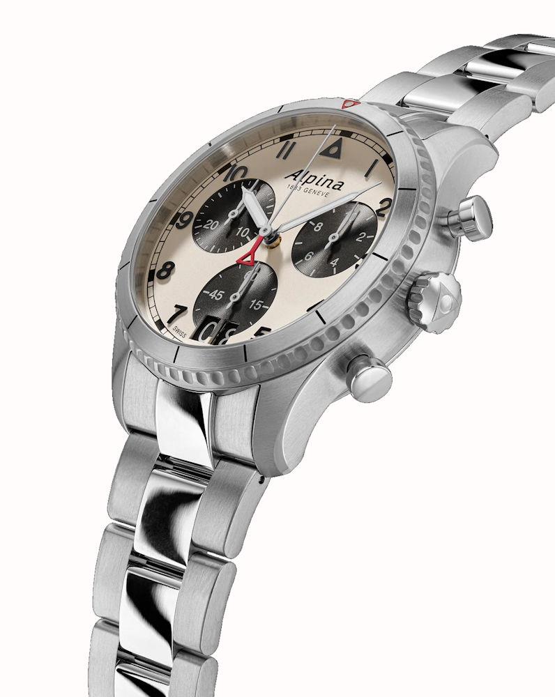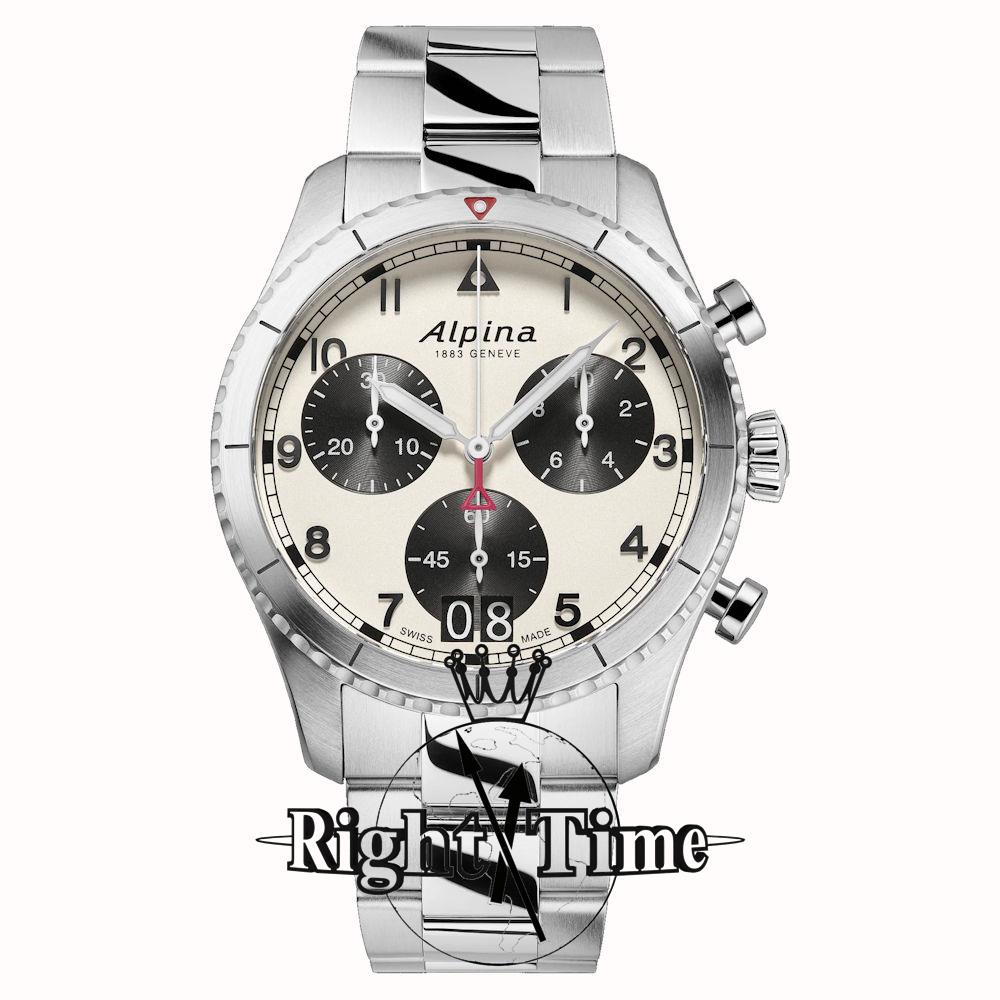 Swiss made Alpina "Startimer" pilot quartz military chronograph big date model AL-372WB4S26B in 41mm stainless steel case with white dial on bracelet