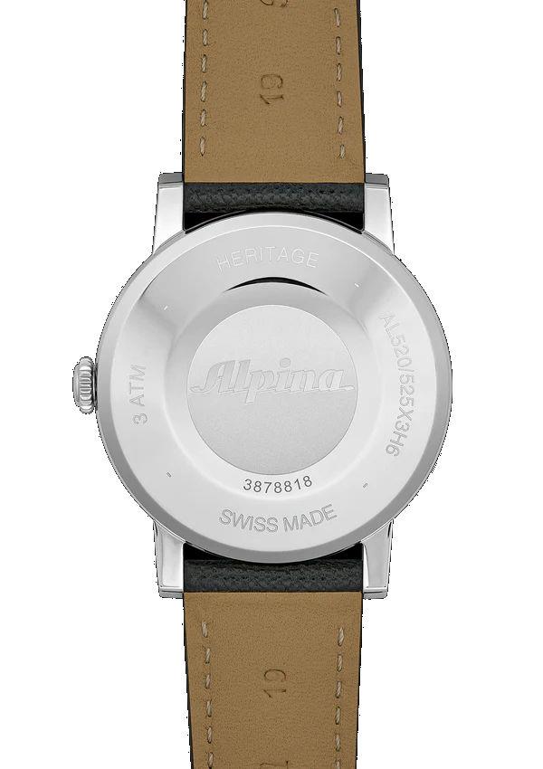 Alpina Heritage Automatic model AL-520BG3SH6. Swiss automatic movement. Stainless steel round case with black leather strap. Ivory dial. 30 meters water resistant.