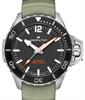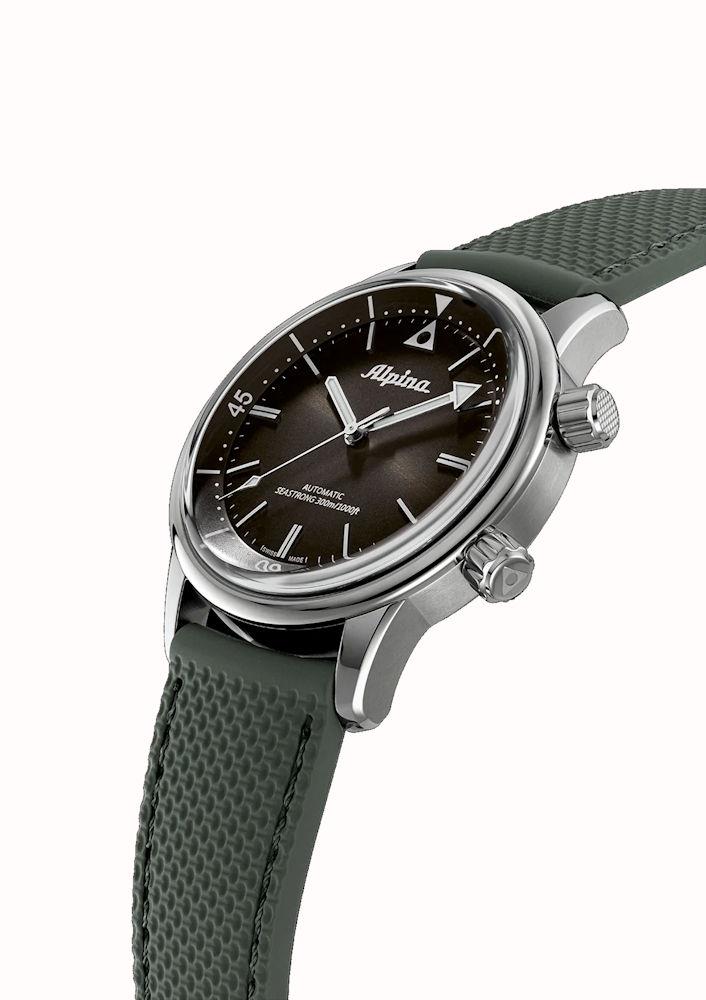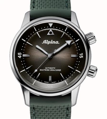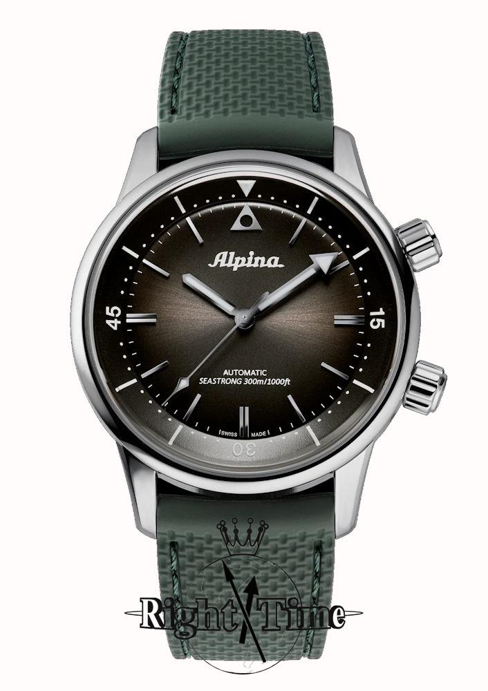 Swiss made Alpina "SeaStrong" diver automatic watch model AL-520GR4H6 in 42mm stainless steel case with black dial. Green rubber strap. Water resistant to 300 meters