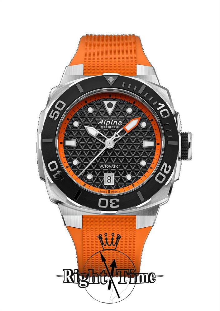 Swiss made Alpina "SeaStrong" diver extreme automatic watch model AL-525B03VE6 in stainless steel. Black dial with triangle pattern, orange outer ring, and date calendar. Comes on orange rubber band. Water resistant to 300 meters