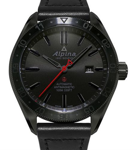 Alpina Alpiner 4 Automatic watch. Model AL-525BB5FBAQ6. Black PVD plated stainless steel 44 mm case with black leather band. Sapphire crystal. Powered by an Aplina caliber AL-525, 25 jewel movement. Antimagnetic. Antishock. Black dial. Water resistant to 100 meters