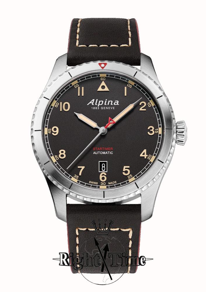 Alpina Startimer Pilot Automatic watch. Model AL-525BBG4S26. Stainless steel 41mm case with black leather strap. Sapphire crystal. Powered by an Aplina caliber AL-525, 25 jewel movement. Black dial with beige luminous indexes. Water resistant to 100 meters