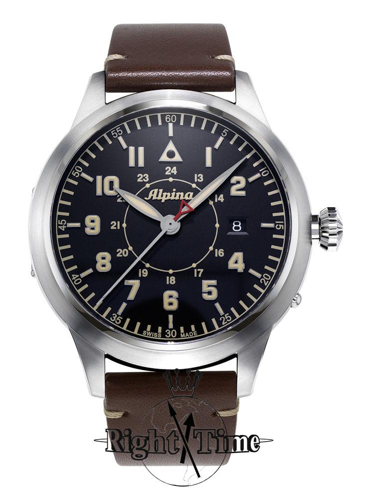 Alpina Startimer Pilot Heritage Automatic watch. Model AL-525BBG4SH6. Stainless steel 44mm case with brown leather strap. Sapphire crystal. Powered by an Aplina caliber AL-525, 25 jewel movement. Black dial with beige luminous indexes. Observation case back with cover. Water resistant to 100 meters