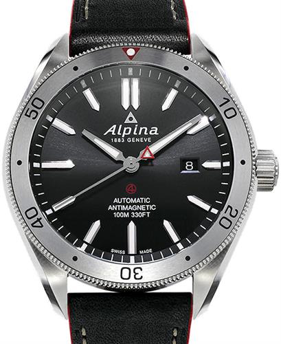 Alpina Alpiner 4 Automatic watch. Model AL-525BS5AQ6. Stainless steel 44 mm case with leather band. Sapphire crystal. Powered by an Aplina caliber AL-525, 25 jewel movement. Antimagnetic. Antishock. Black dial. Water resistant to 100 meters