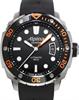 Alpina Extreme Diver automatic watch. Water resistant to 300 meters. Steel case with rubber strap. Black textured dial with large luminous markers. Black ceramic scratch resistant 0-60 bezel with orange numerals. Model AL-525LBO04V26.