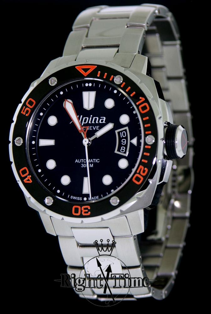 Alpina Extreme Diver automatic watch. Water resistant to 300 meters. Stainless steel case and bracelet with butterfly clasp. Black textured dial with large luminous markers. Black ceramic scratch resistant 0-60 bezel with orange numerals. Model AL-525LBO4V26B