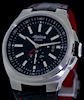 Sporty and elegant with a broad look. 47mm stainless steel case. Black textured dial with applied luminous steel markers on black leather band with red color stitching matching second hand tip.