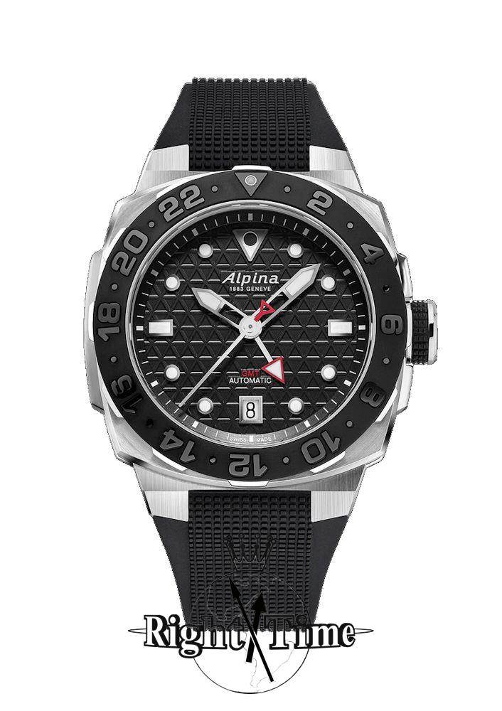 Swiss made Alpina "SeaStrong" diver extreme automatic watch model AL-560B3VE6 in stainless steel. Black dial with triangle pattern, date calendar and second time-zone indicator. Comes on black rubber band. Water resistant to 300 meters
