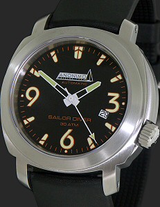 Anonimo Opera Meccana Sailor Dive watch. Limited Edition of 199 pieces. Sellita SW200 based automatic movement. Sandblasted finish solid 316 stainless steel case. Black dial with extra large luminous red outlined numerals. Black rubber band.