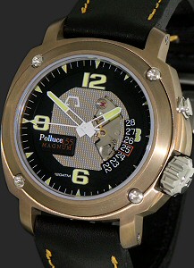 Anonimo Firenze Opera Meccana Polluce 455 Magnum watch. Limited Edition of 299 pieces. Sandblasted finish solid bronze super-diver 1200m case. Textured dial with date and luminous numbers. Black leather band with bronze color stitching to match the color of the case.